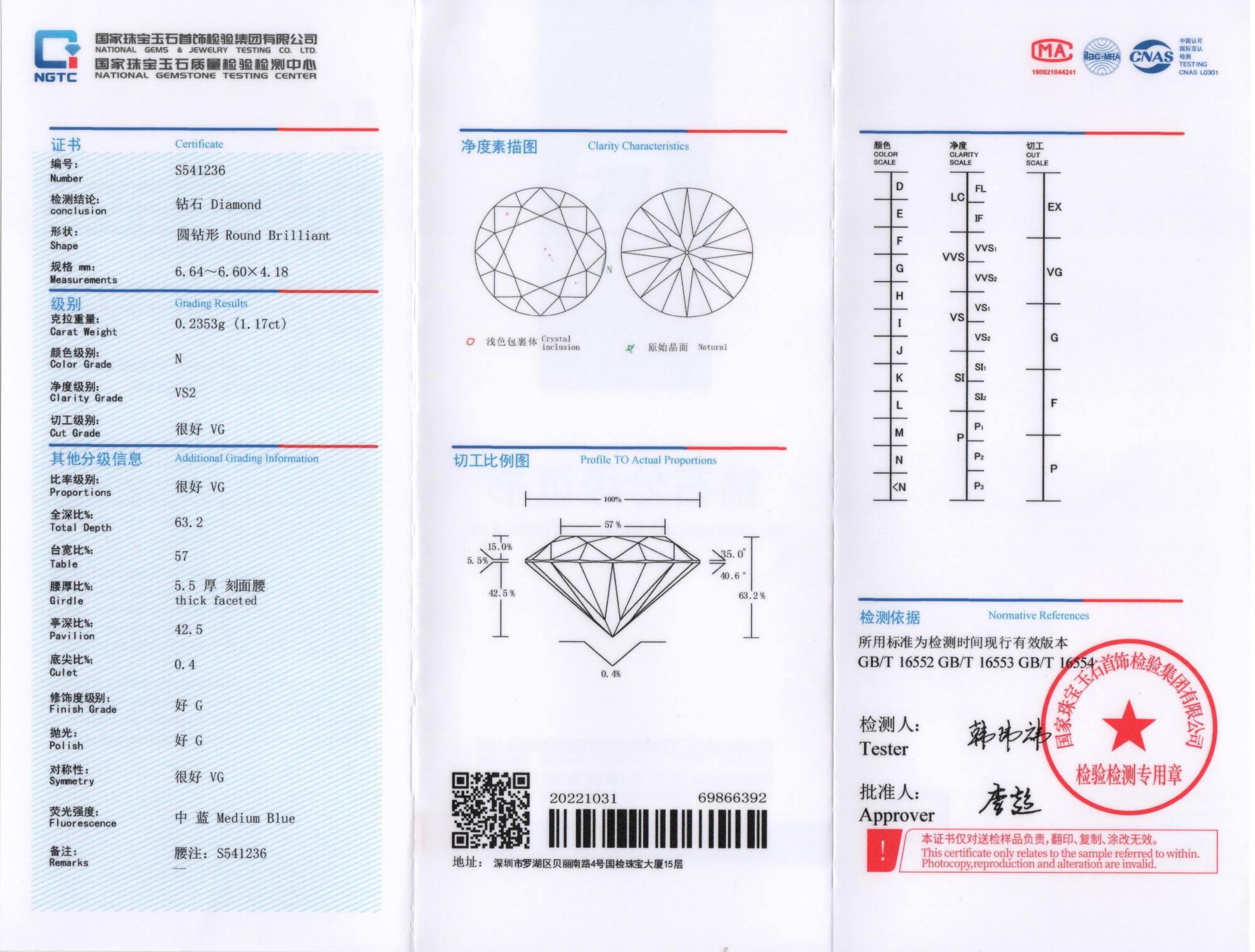 主钻1.17克拉 N色 净度VS2 圆形钻 特价3W国检NGTC541236