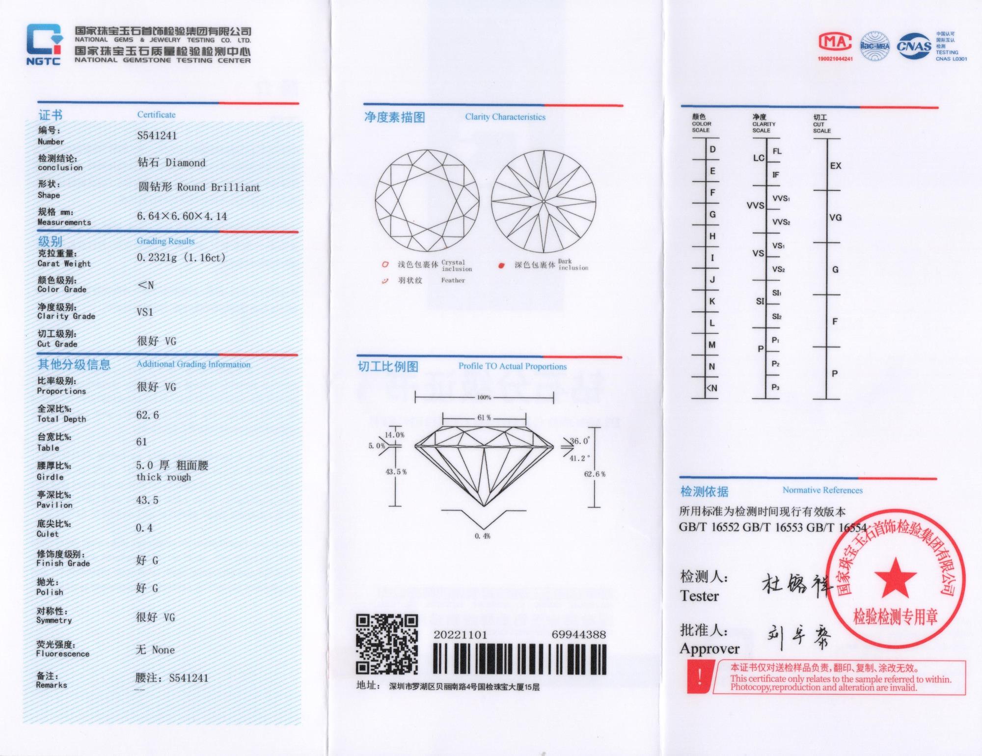 主钻1.16克拉小N色 净度VS1 圆形钻 特价3W国检NGTC541241