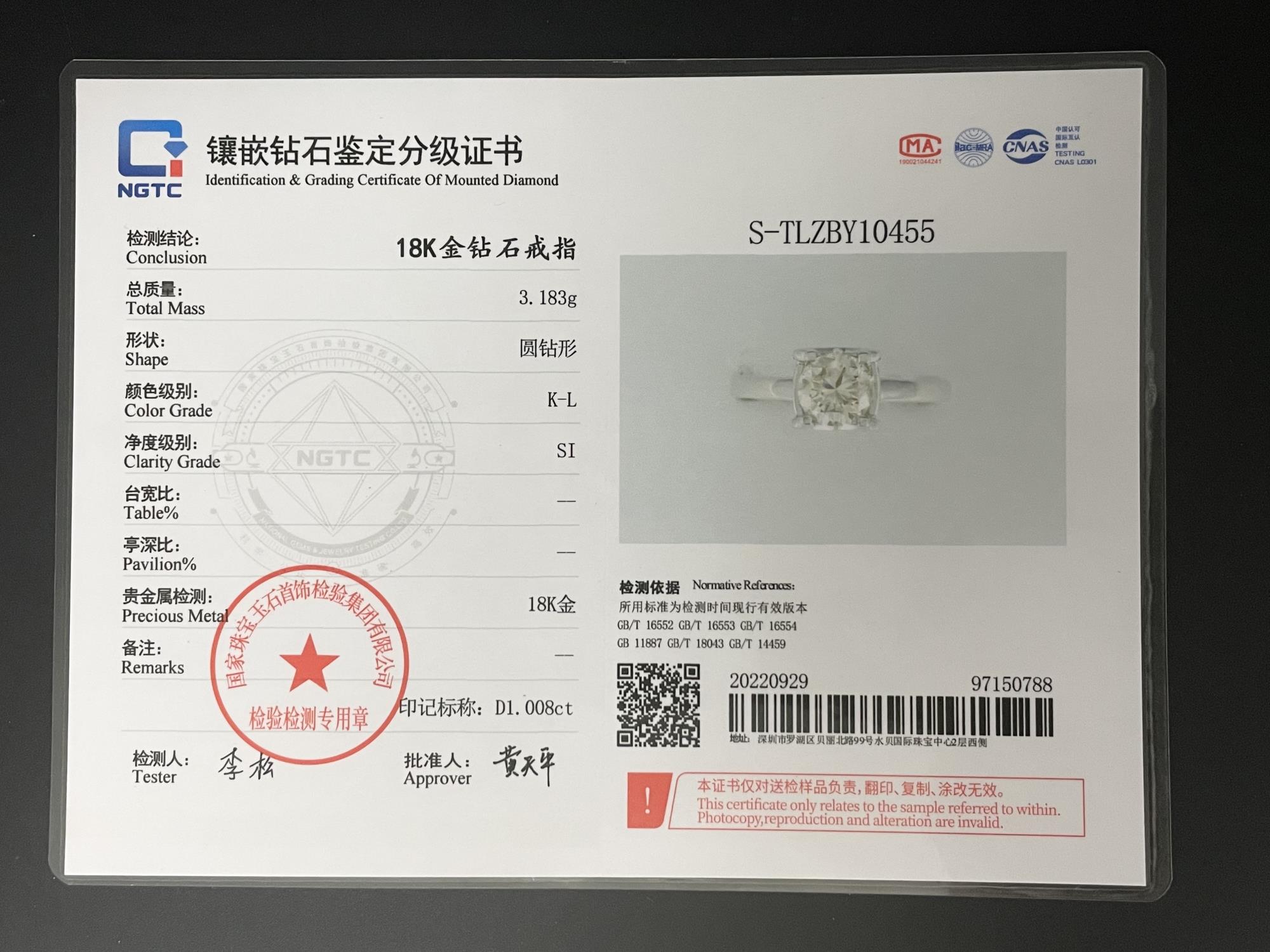主钻1.008克拉KL色SI净度圆形钻 特价3.17W国检NGTC110455