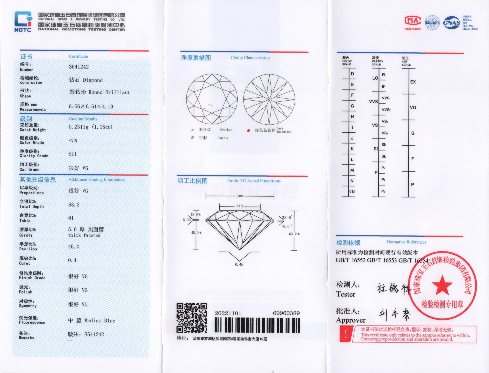 主钻1.15克拉小N色 净度SI1 圆形钻 特价3.2W国检NGTC541242