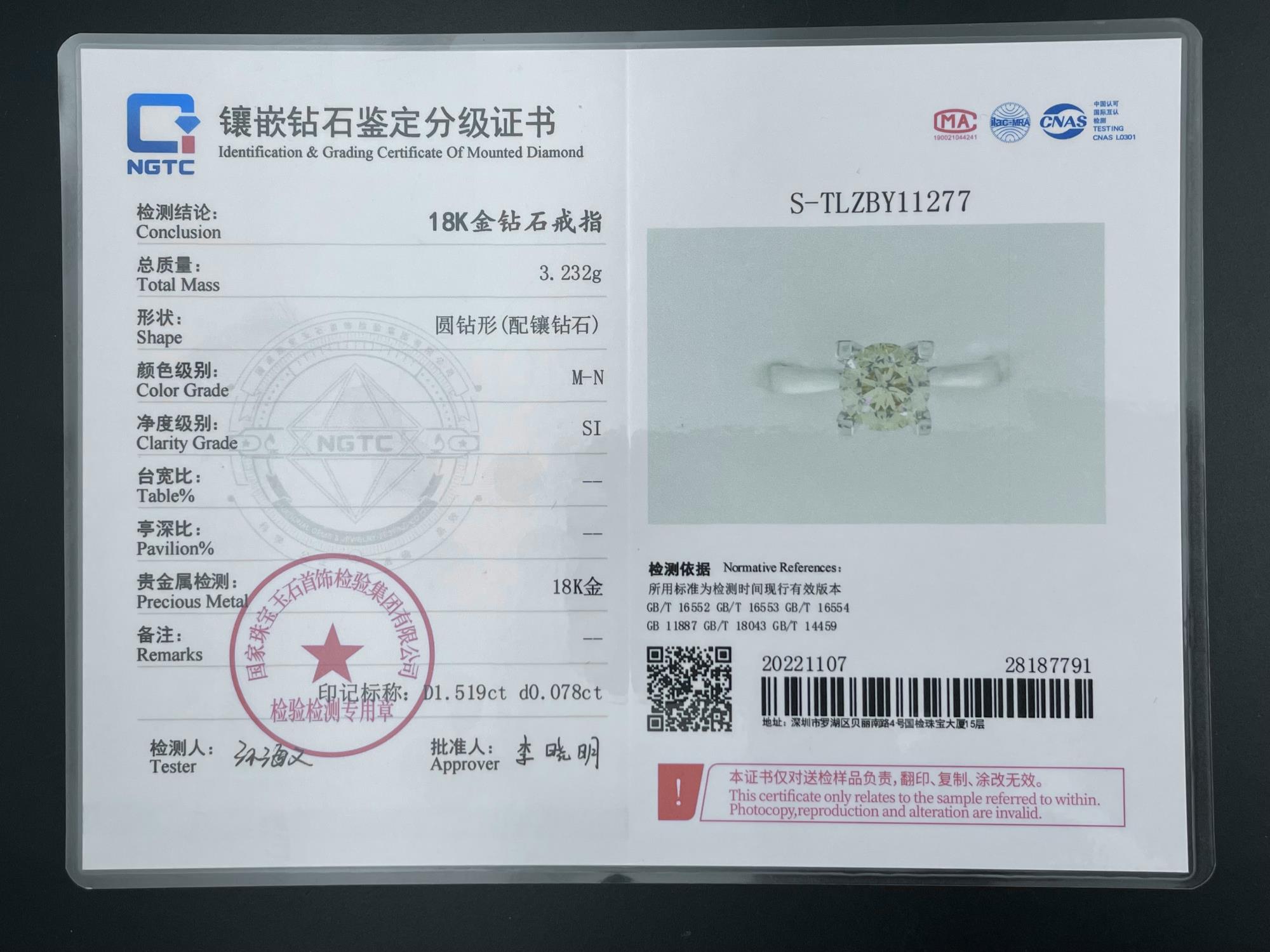 主钻1.519克拉MN色SI净度圆形钻 特价3.34W国检NGTC561277