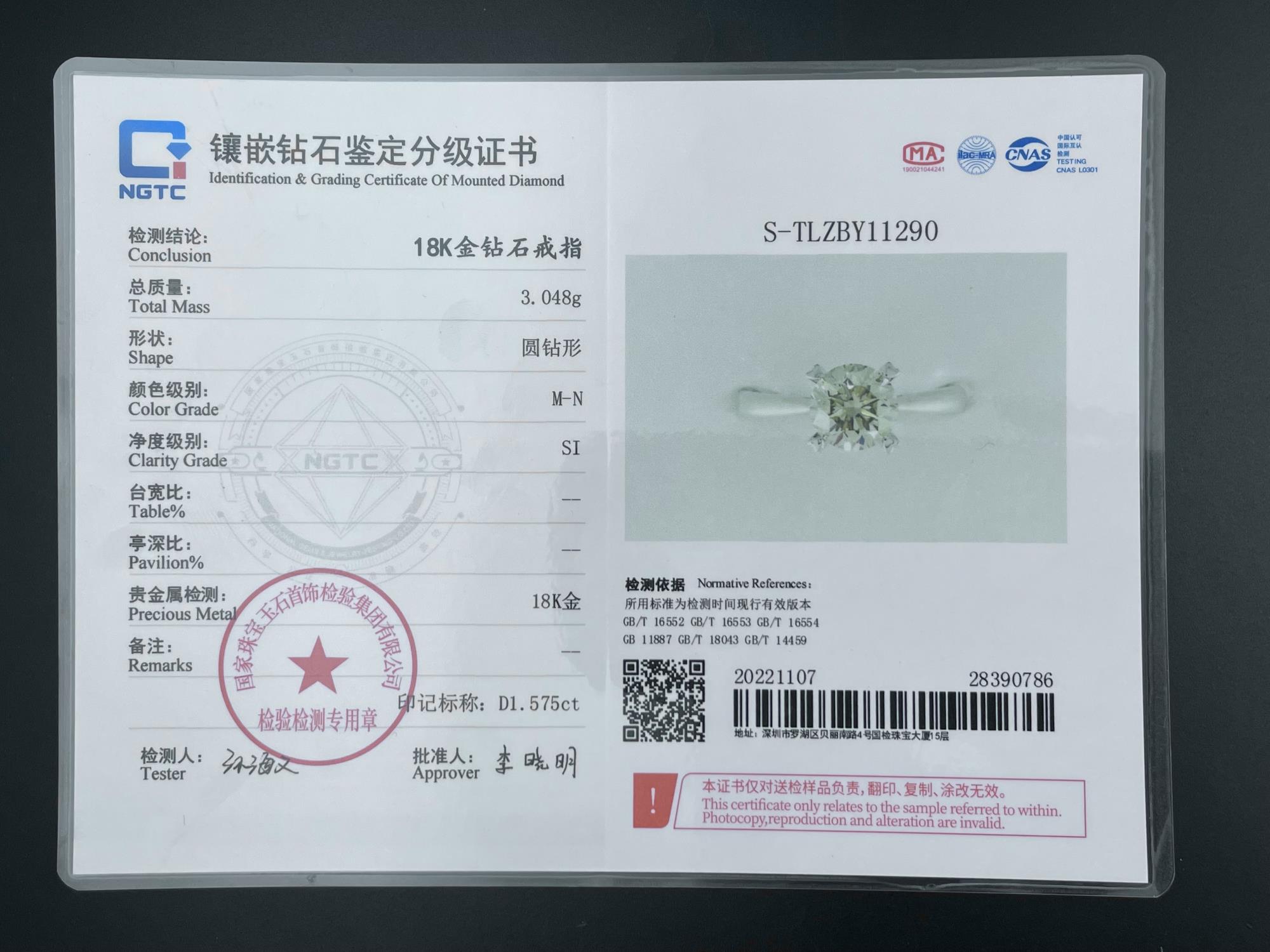 主钻1.575克拉MN色SI净度圆形钻 特价5.34W国检NGTC061290