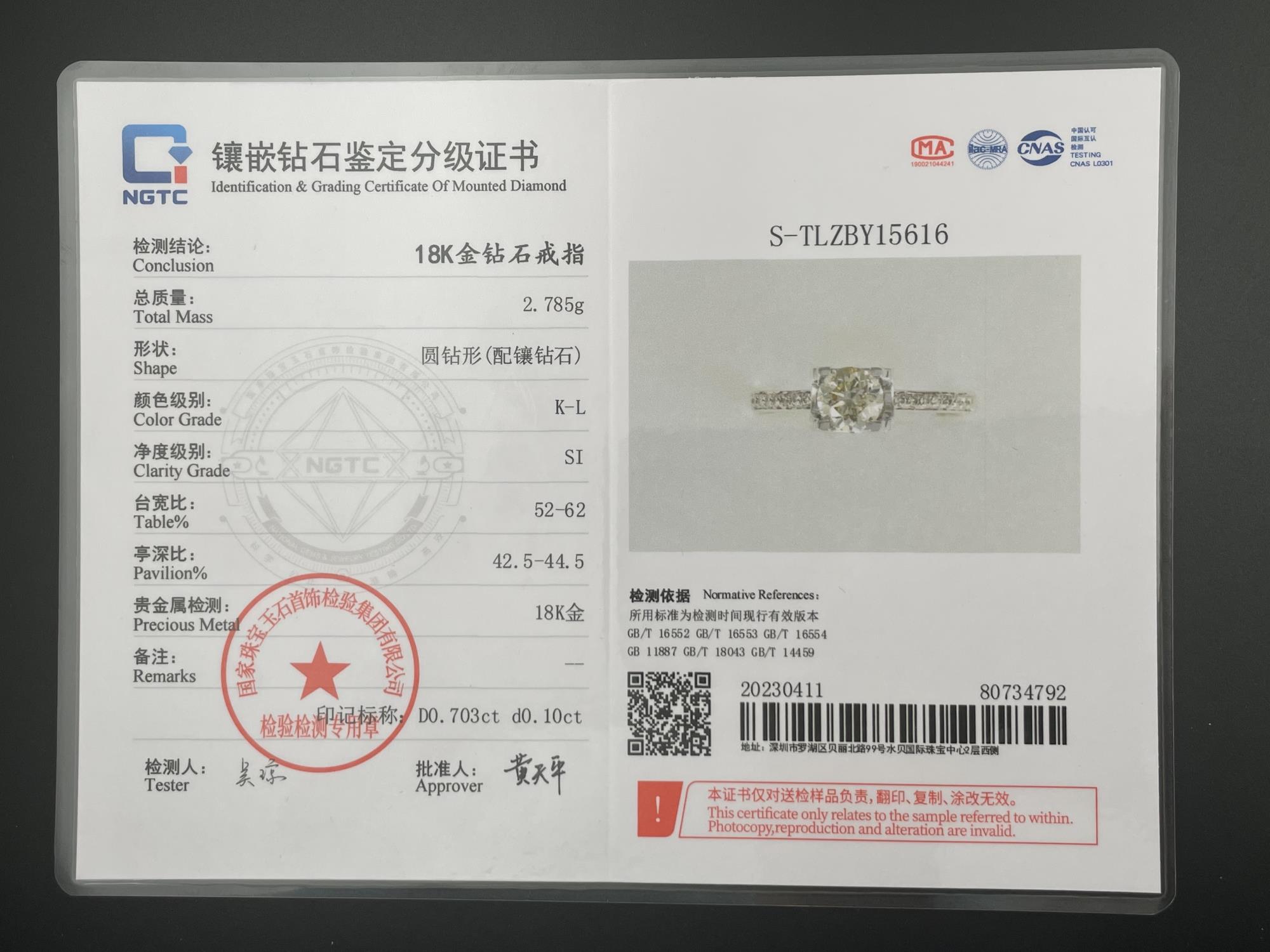主钻70.3分KL色SI净度圆形钻 特价2W国检NGTC705116