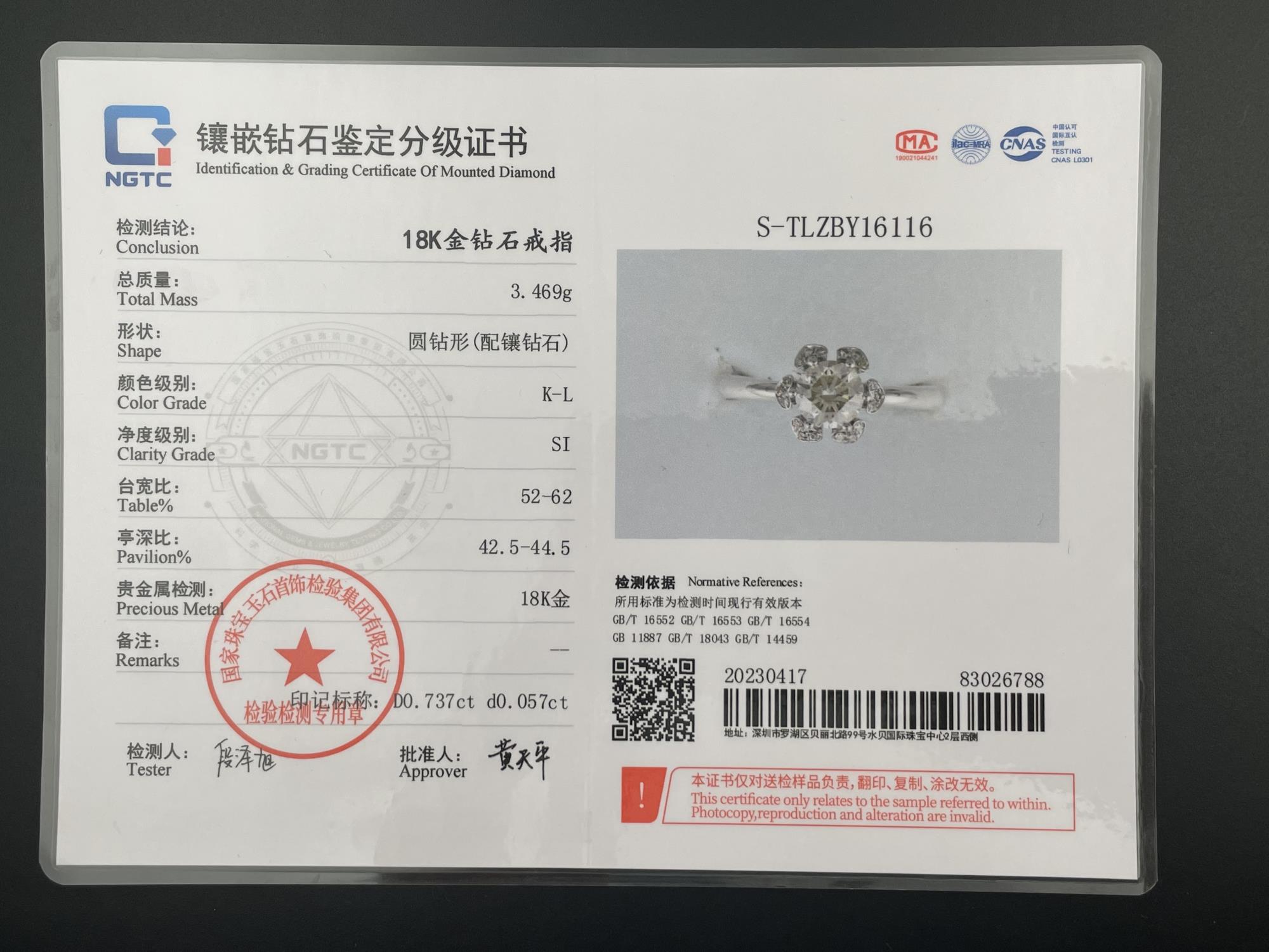 主钻73.7分KL色SI净度圆形钻 特价1.84W国检NGTC708816