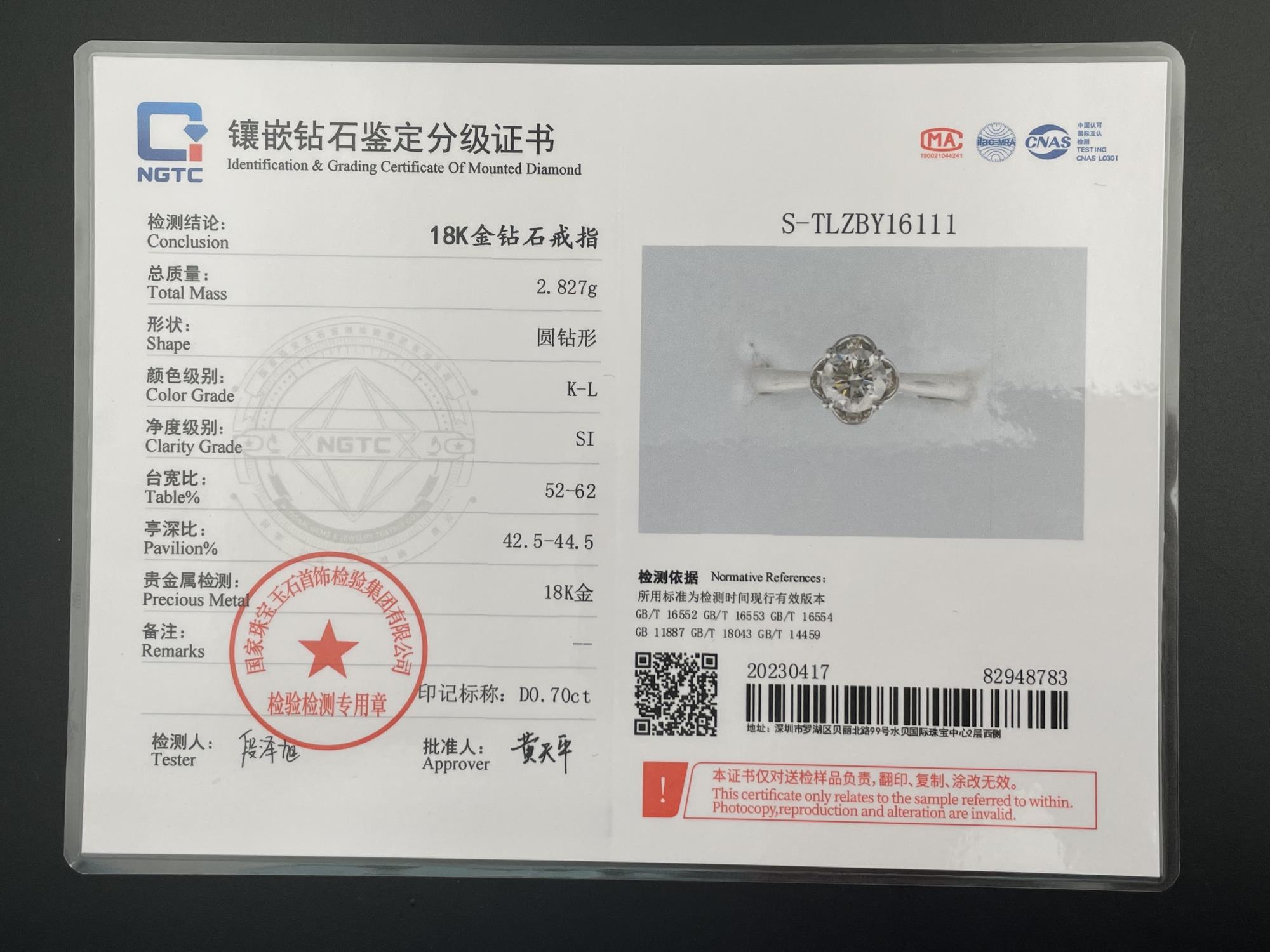 主钻70分KL色SI净度圆形钻 特价1.67W国检NGTC701011