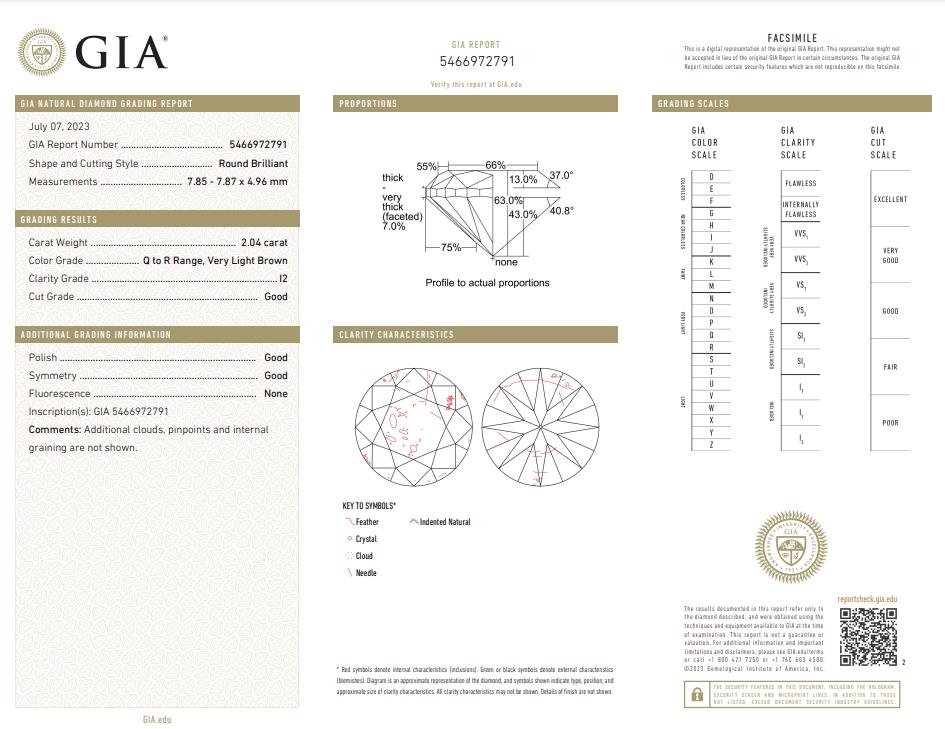 主钻2.04克拉O-R色 净度I2圆形钻 特价7W元GIA202791