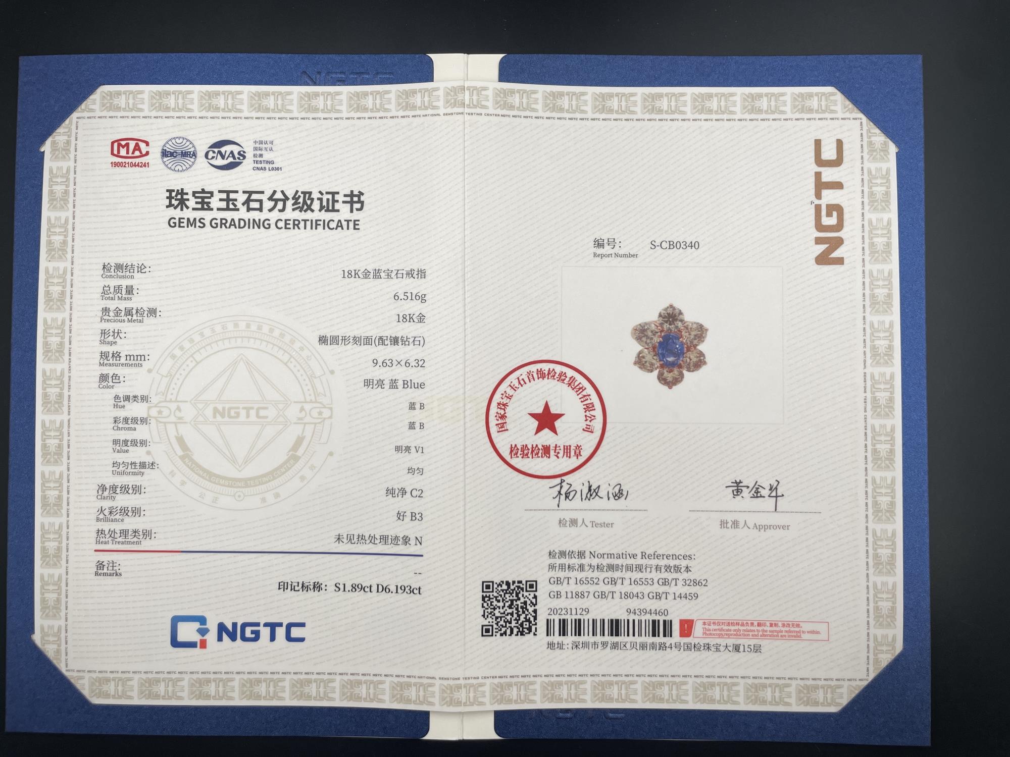 主石:椭圆形无烧蓝宝石1.89克拉 副石:钻石6.193克拉 特价20.34W国检NGTC809240