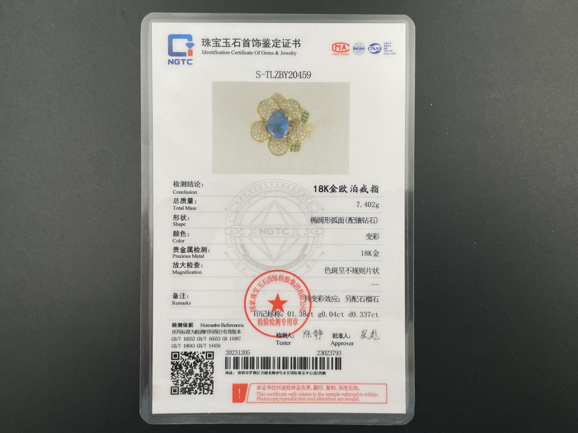 主石:椭圆形欧泊1.38克拉 副石:钻石0.337克拉 石榴石0.04克拉 特价3.3W国检NGTC750759