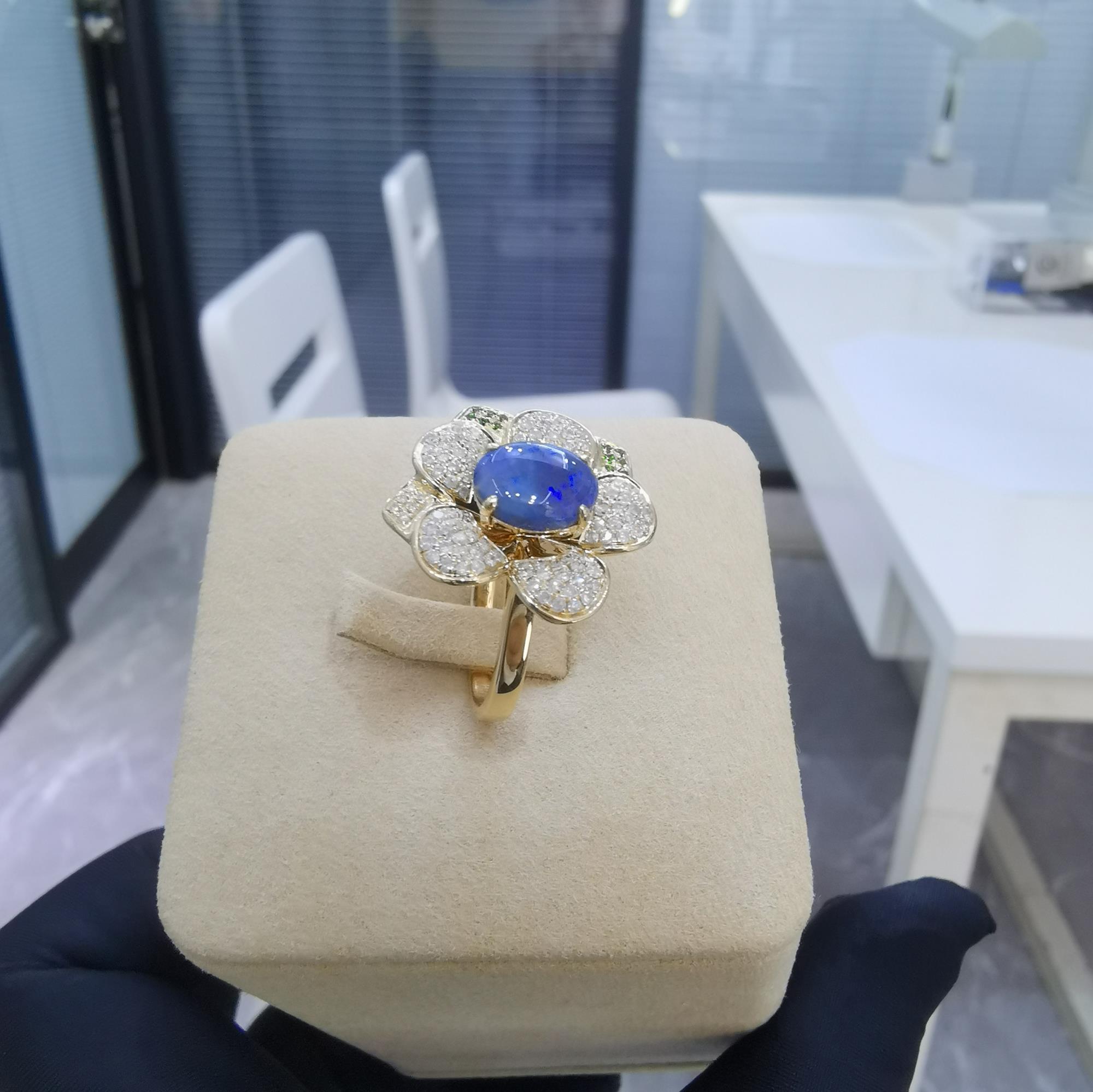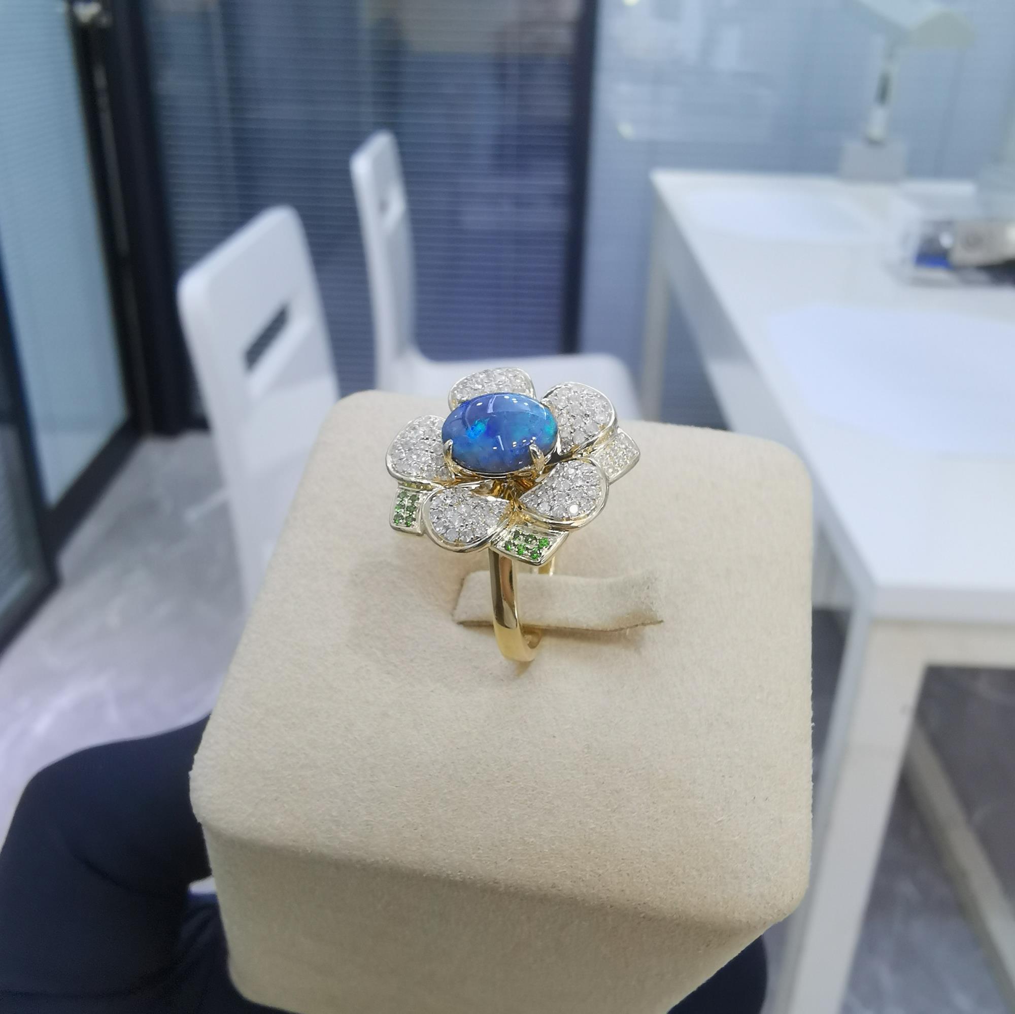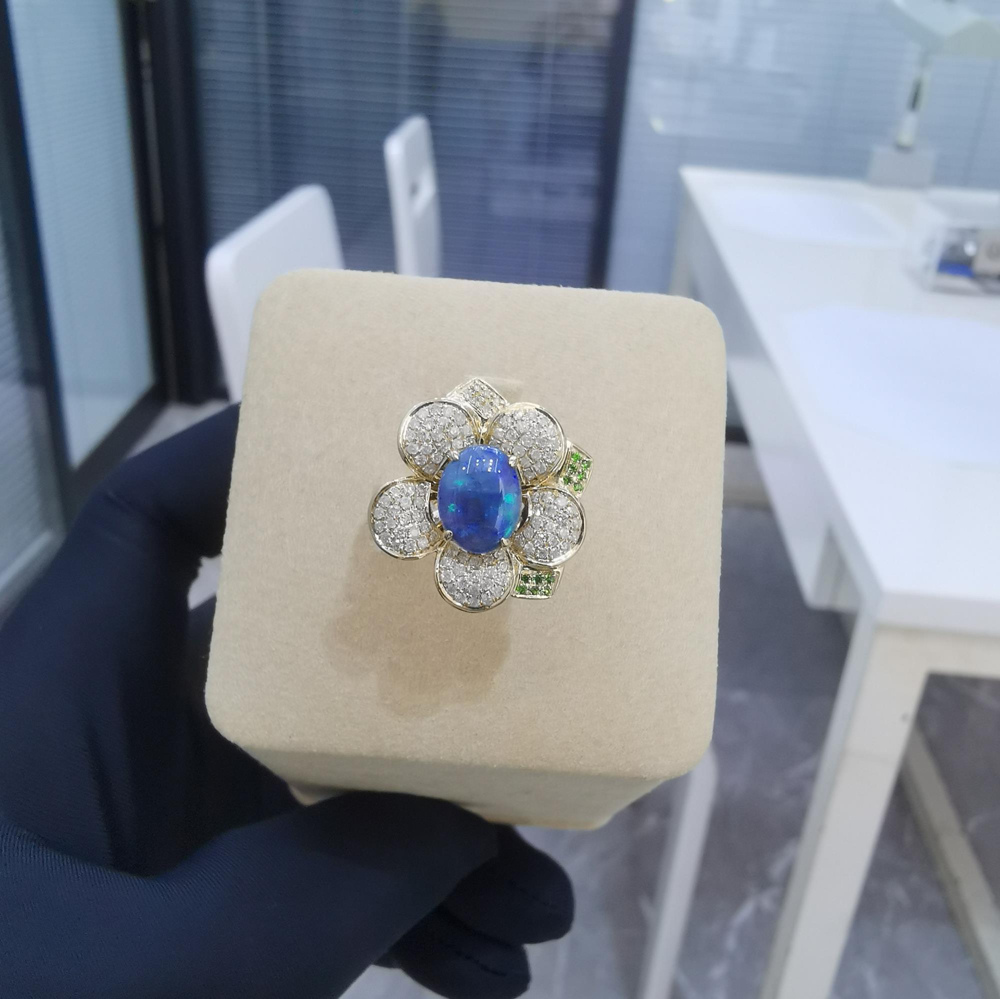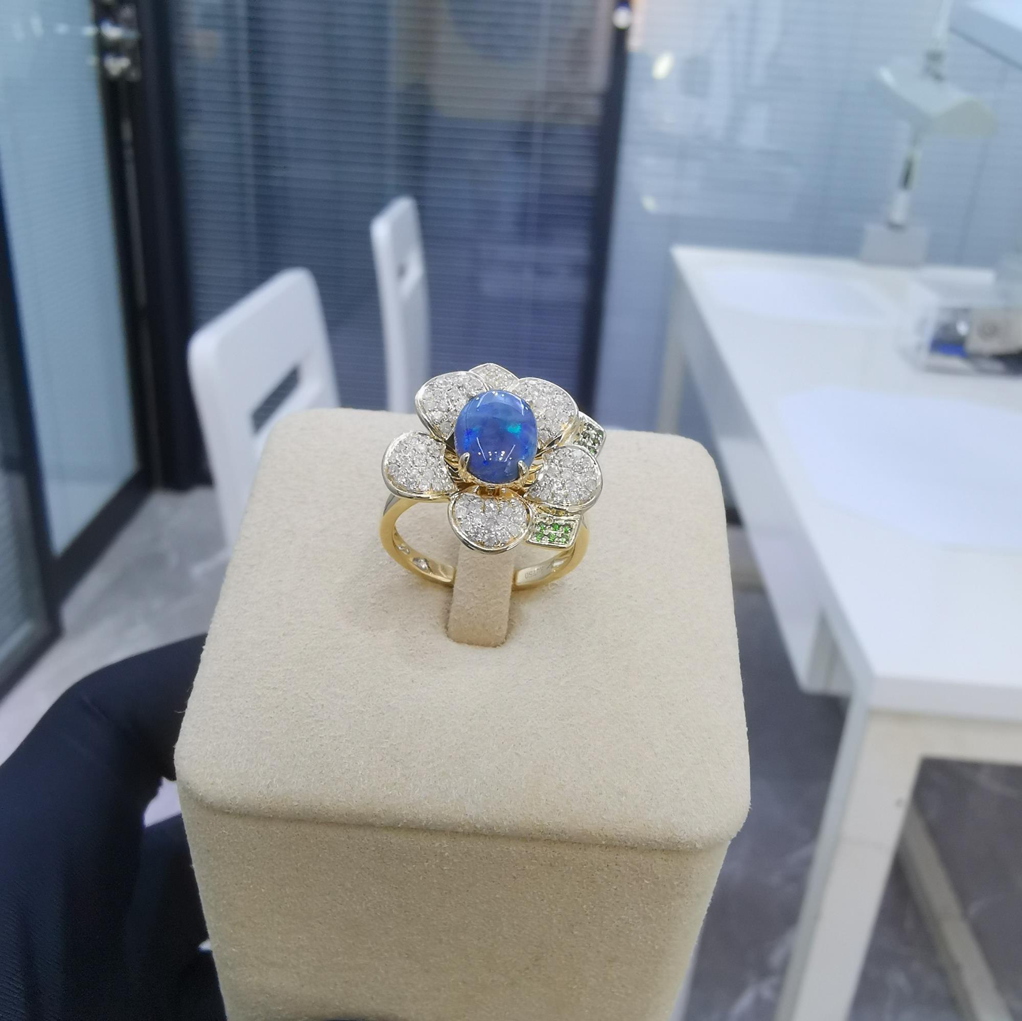 主石:椭圆形欧泊1.38克拉 副石:钻石0.337克拉 石榴石0.04克拉